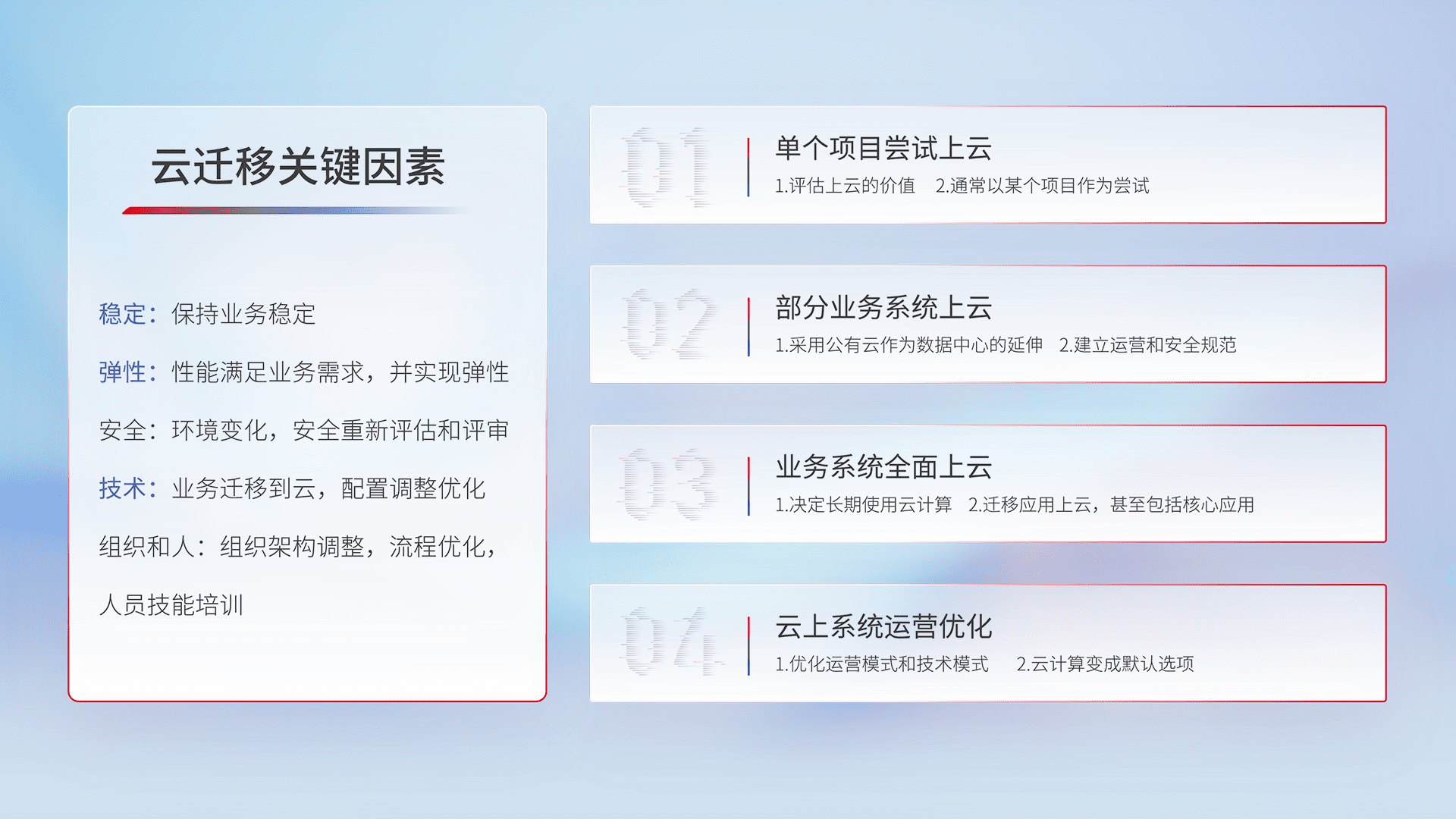 结合实际业务,,从规划设计、、、、云平台选型、、、云原生改造、、、数据迁移、、、、集成交付,,,迁移全过程为客户识别最佳上云路径,,做好风险识别管理,,设计网络架构、、身份权限、、、、安全审计合规、、操作审计、、、、日志审计、、、、监控告警策略、、、、多站点容灾设计等,,,,对云上基础设施进行整体规划,,提升IT治理水平,,,以满足弹性、、高可用、、高性能的需求。。