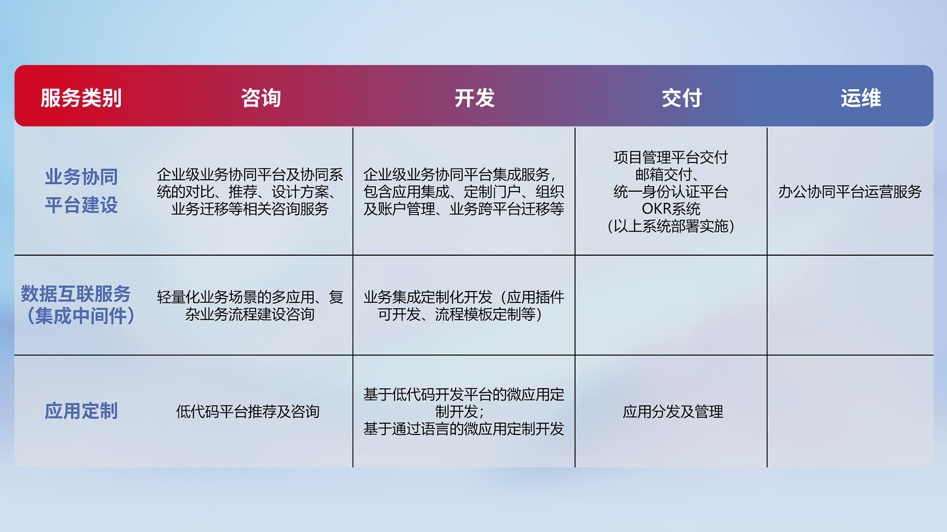 针对钉钉、、企微、、IDaas等平台级产品提供产品的规划、、、、方案、、、、交付、、、定制化开发等服务,,实现如统一协同办公、、、智能客户服务、、、混合会议管理、、、智能数据查询、、、、等业务场景,,,,实现数字化转型。。。